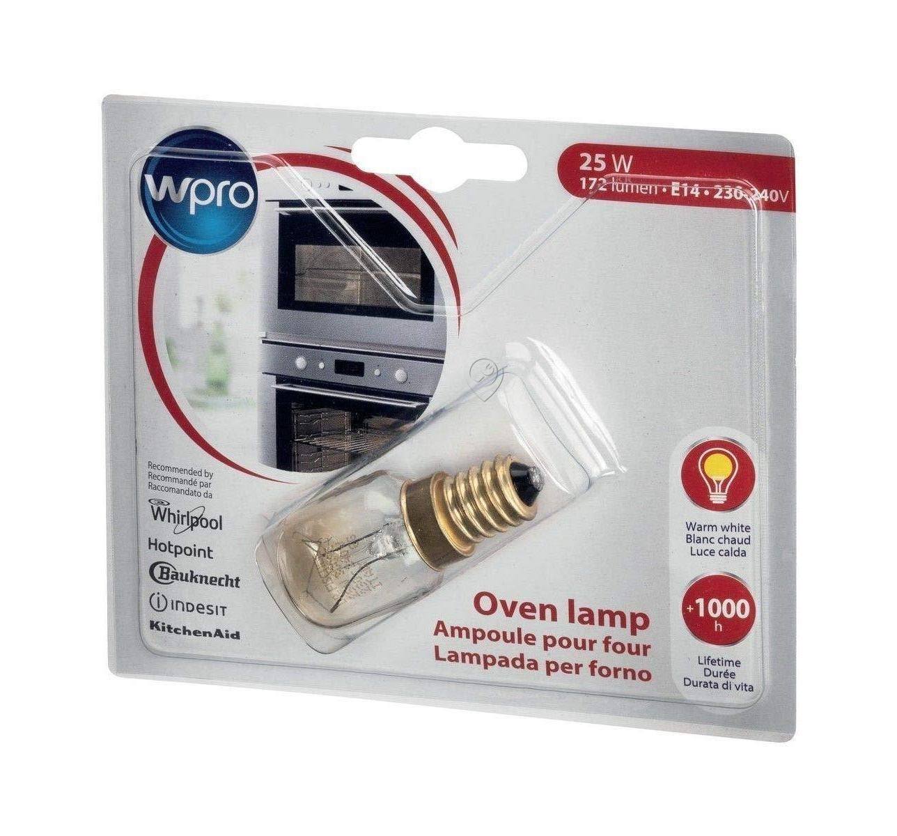 • Becul pentru cuptor Wpro, cu o putere de 25W, este proiectat să reziste la temperaturi de până la 300°C, fiind ideal pentru utilizarea în cuptoare.