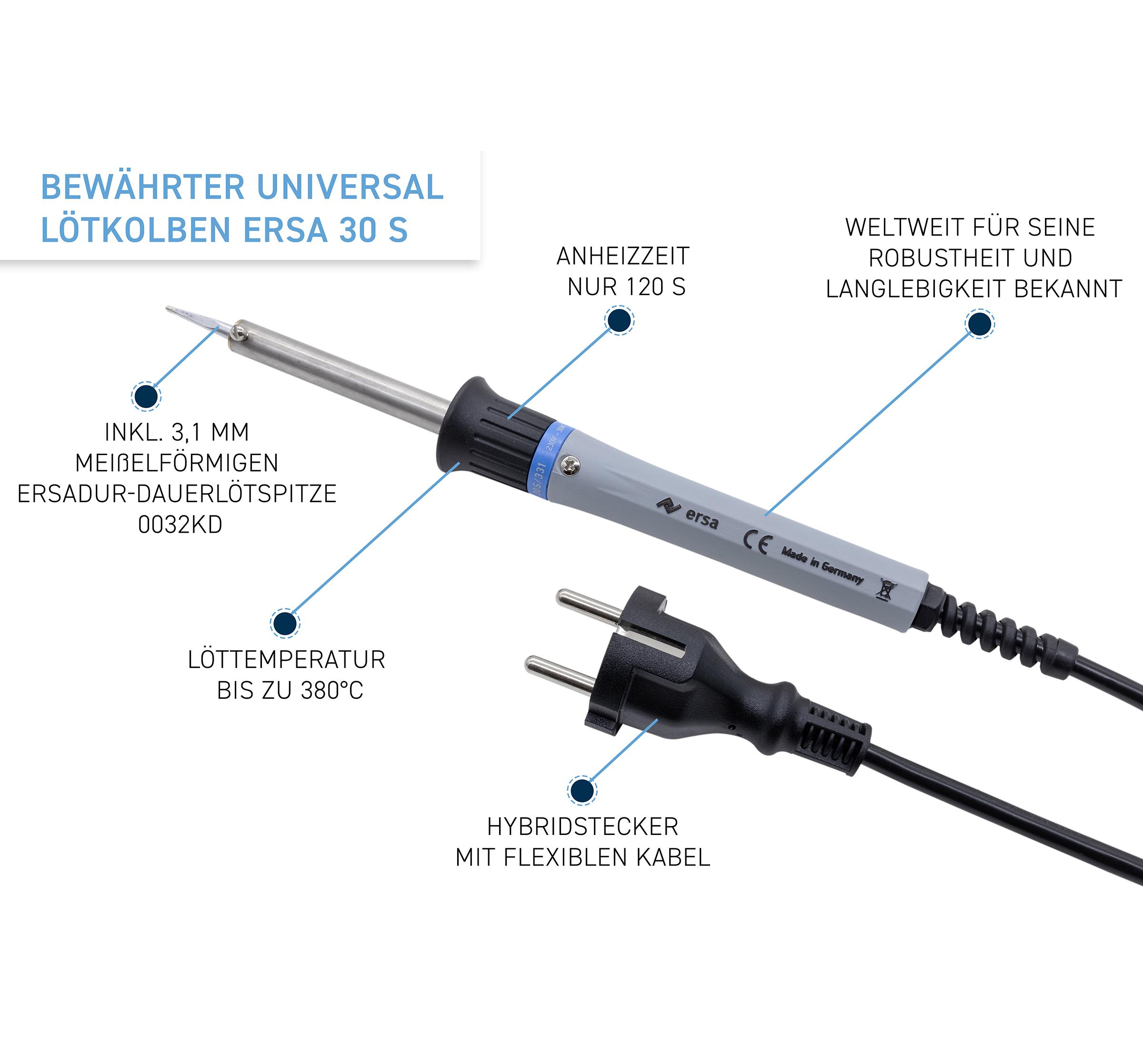 • Letconul electric ERSA 30 S (30W) este un instrument universal de lipit, recunoscut la nivel mondial pentru robustețea și durabilitatea sa, fiind unul dintre cele mai vândute produse din această categorie.