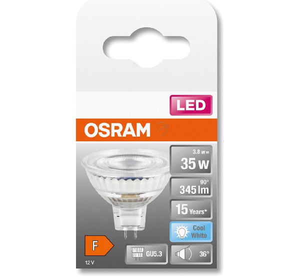 • Becul LED Osram Star PAR MR16 (35) oferă o iluminare eficientă și durabilă, având un consum de doar 3,8W și o tensiune de 12V.