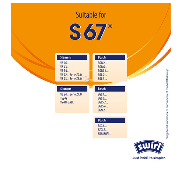 • Sacii de aspirator Swirl® S67®, disponibili în pachet de 10, sunt compatibili cu modelul Siemens G All.
